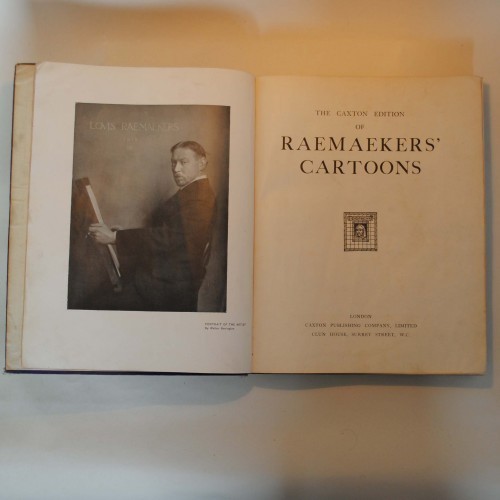 The Caxton Edition of Raemaekers' Cartoons. No date (c1920). Published by the Caxton Publishing Company Ltd, London. 4to. (approx 12" H x 9.5"W). Boards in violet cloth with embossed title. 316pp; 158 lithographs. No dust jacket. Boards stained and bumped; Loss to the top of the spine; Upper board is split part way up the spine groove; Page margins are dirty in places with fingerprints & marks.; All plates present, but 2 with closed tears. This edition presents a comprehensive selection of the highly emotional political drawings of the First World War by Belgian artist Louis Raemaekers. Each plate is accompanied by a description by (amongst others) G.K. Chesteron, Eden Phillpott, John Buchan, Herbert Warren. This book will be of interest to anyone studying the First World War, political cartoons or illustrations, though the book condition is only fair.